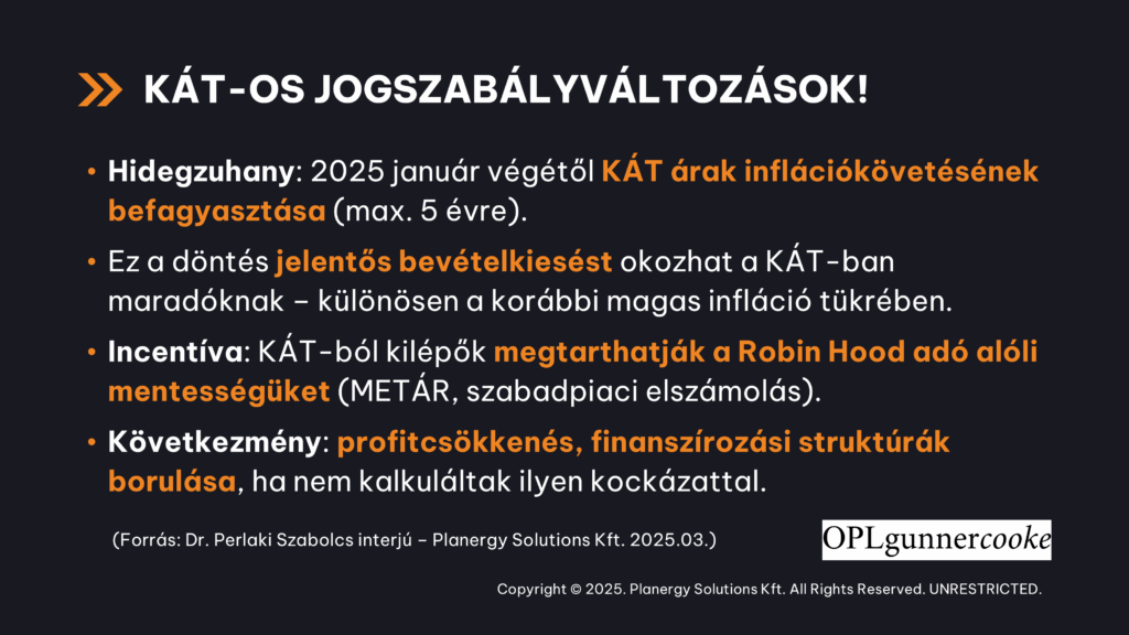 Ennek hátterében a 2025 januárjában életbe lépett jogszabályváltozás áll, ami visszamenőleges hatállyal belenyúlt a KÁT-szerződésekbe. A módosítás lényege, hogy a KÁT-árak inflációkövetését befagyasztják a 2024-es szinten, legfeljebb öt évre. Fontos hozzátenni, hogy ha az infláció meghaladja a 6%-ot, ezt a korlátozást elengedik, de jelenleg még ez alatt vagyunk.