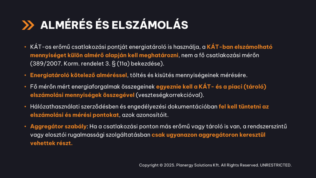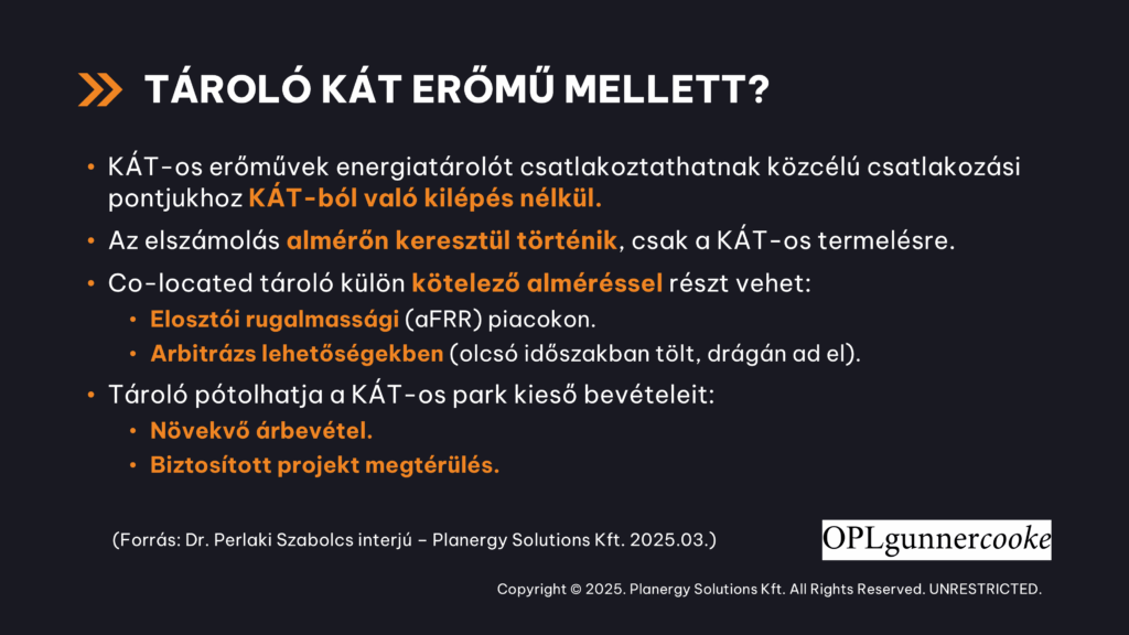 Az új szabályozás egyértelmű üzenetet hordoz. A KÁT-os park megmaradhat a KÁT-elszámolásban, miközben akkumulátorral bővíthető (a KÁT-os elszámolástól függetlenül). Az energiatároló pedig részt vehet a rendszerszintű szolgáltatások piacán.