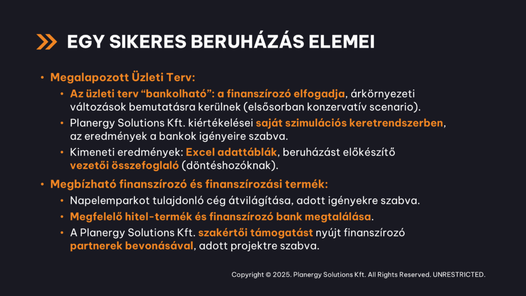 Alapvetően szükség van egy megalapozott, bankok által elfogadható üzleti tervre. A KÁT-os parkokat jellemzően magyar bankok finanszírozták, és azt látjuk, hogy a bankok részéről nagy az érdeklődés az energiatárolók finanszírozása iránt is. Ezért arra számítunk, hogy a legtöbb beruházás itt is banki finanszírozásból valósul meg.
