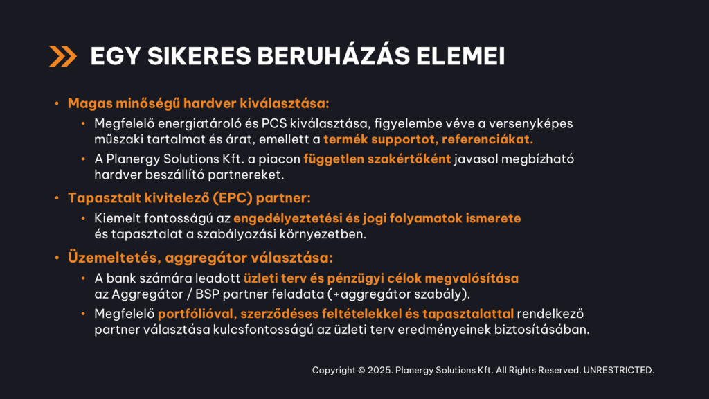Az üzemeltetésnél az aggregátor választása kritikus. Az üzleti tervet, amit mi, a Planergy Solutions a bankok számára prezentálunk, azt a mindennapi gyakorlatban egy aggregátor fogja megvalósítani. Ezért fontos, hogy az aggregátor megfelelő portfólióval és kedvező szerződéses feltételekkel rendelkezzen, ezzel csökkenthetőek a kockázatok is.